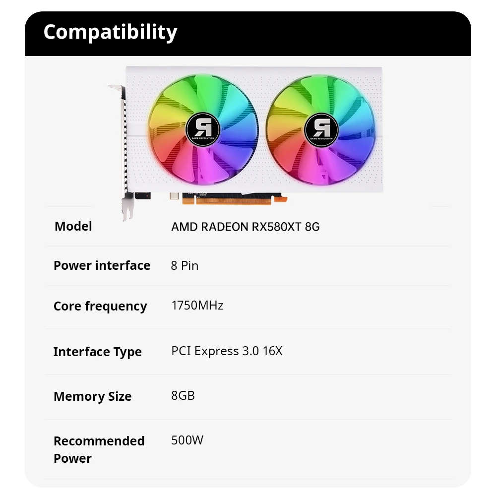 • Powerful AMD GPU :Experience superior gaming performance with the GAME REVOLUTION RX 580 8GB GDDR5 256bit White RGB AMD GPU. It’s designed to deliver high-quality graphics for an immersive gaming experience.
