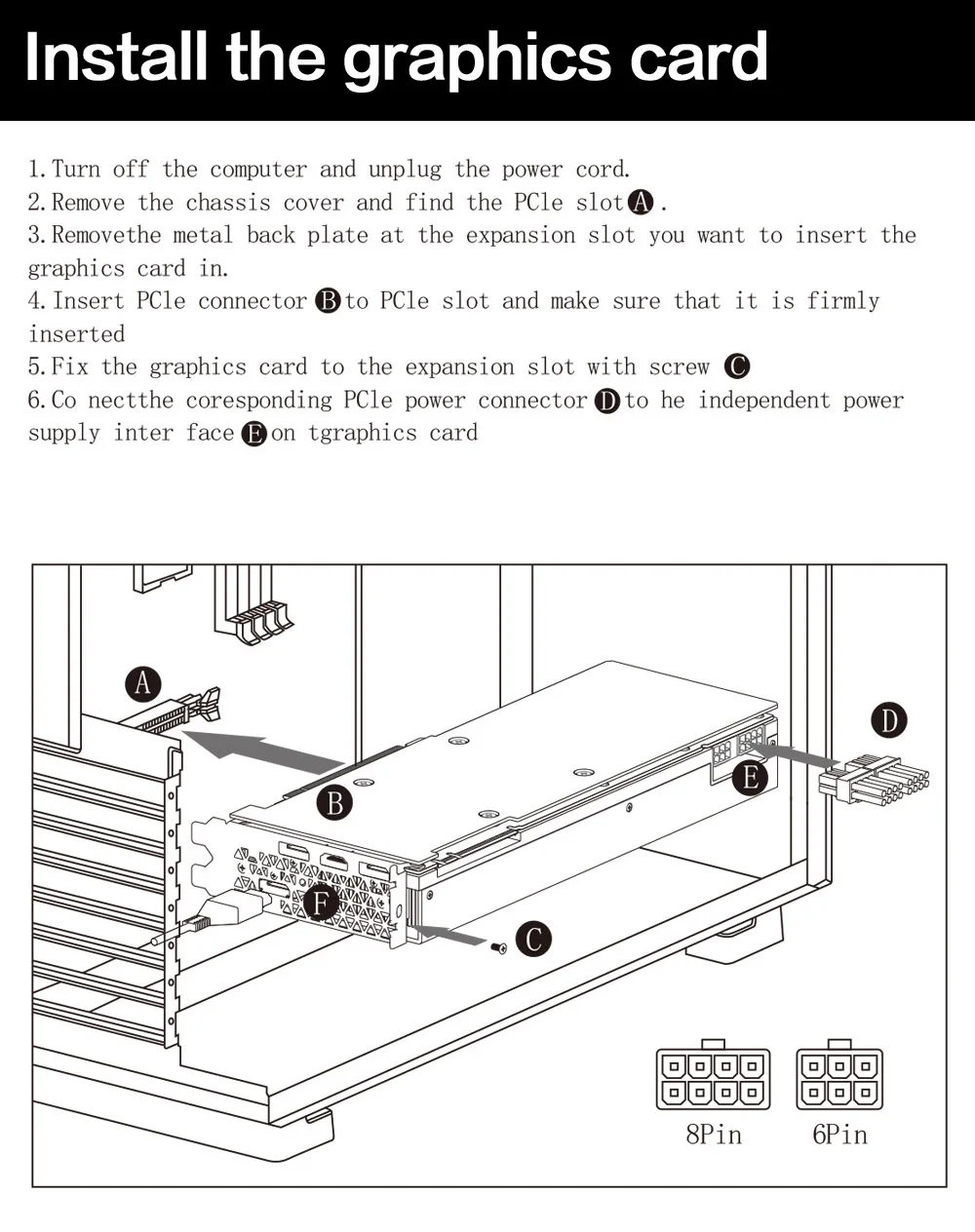 6. Co nectthe coresponding PCle power connector (D) to he independent power supply inter face (E) on graphics card